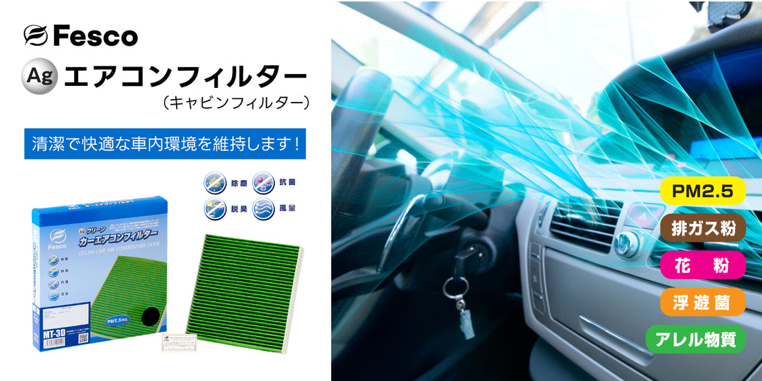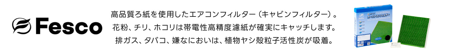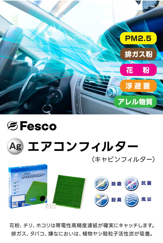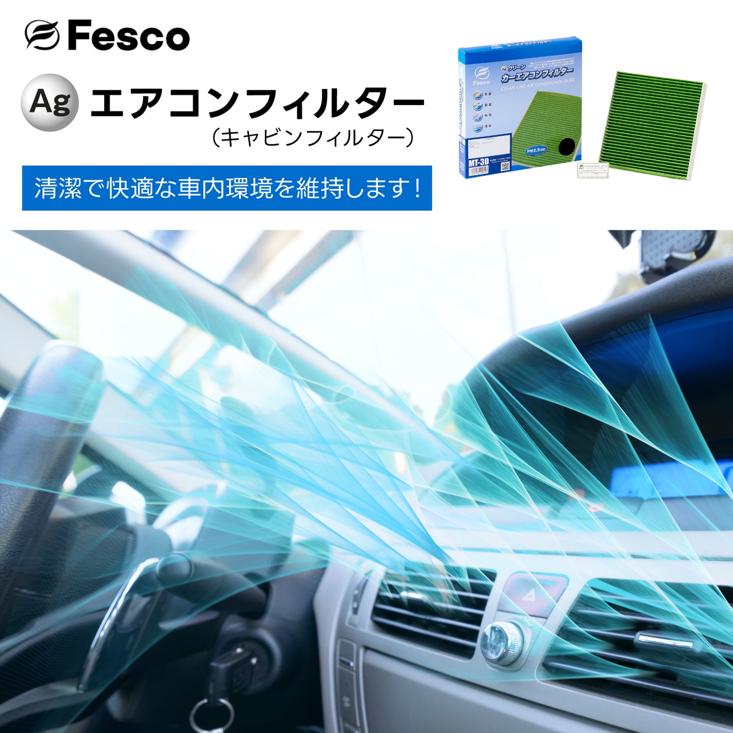 高性能フィルターが快適な車内環境を維持します! FESCO Ag カーエアコンフィルターシリーズ 国産車の販売主力車種を中心に最新車種まで対応した充実のラインナップ。 PM2.5の微細な粒子もブロックする高除塵フィルターで、ウイルスや排ガスなど嫌なニオイや粉塵、花粉除去に効果を発揮します。 また安定風量性能でキレイな空気の流れによりエアコン効率もアップします。※古いフィルターが入っている場合は交換して下さい。※エアコンフィルター交換の場合は必ず車種に適合する品番を選び使用してください。※交換の場合は必ずエアコン及びエンジンを停止してください。※エアコンフィルターに印字されている矢印の方向に合わせて取り付けてください。※逆に取り付けた場合フィルター機能低下の原因となります。
