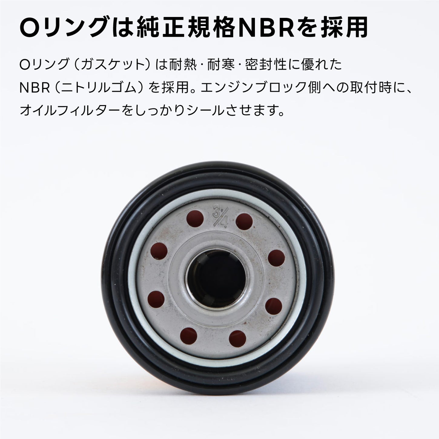 O"リング(ガスケット)は耐熱・耐寒・密封性に優れたNBR(ニトリルゴム)を採用。エンジンブロック側への取付時に、オイルフィルターをしっかりシール(密封)させます。